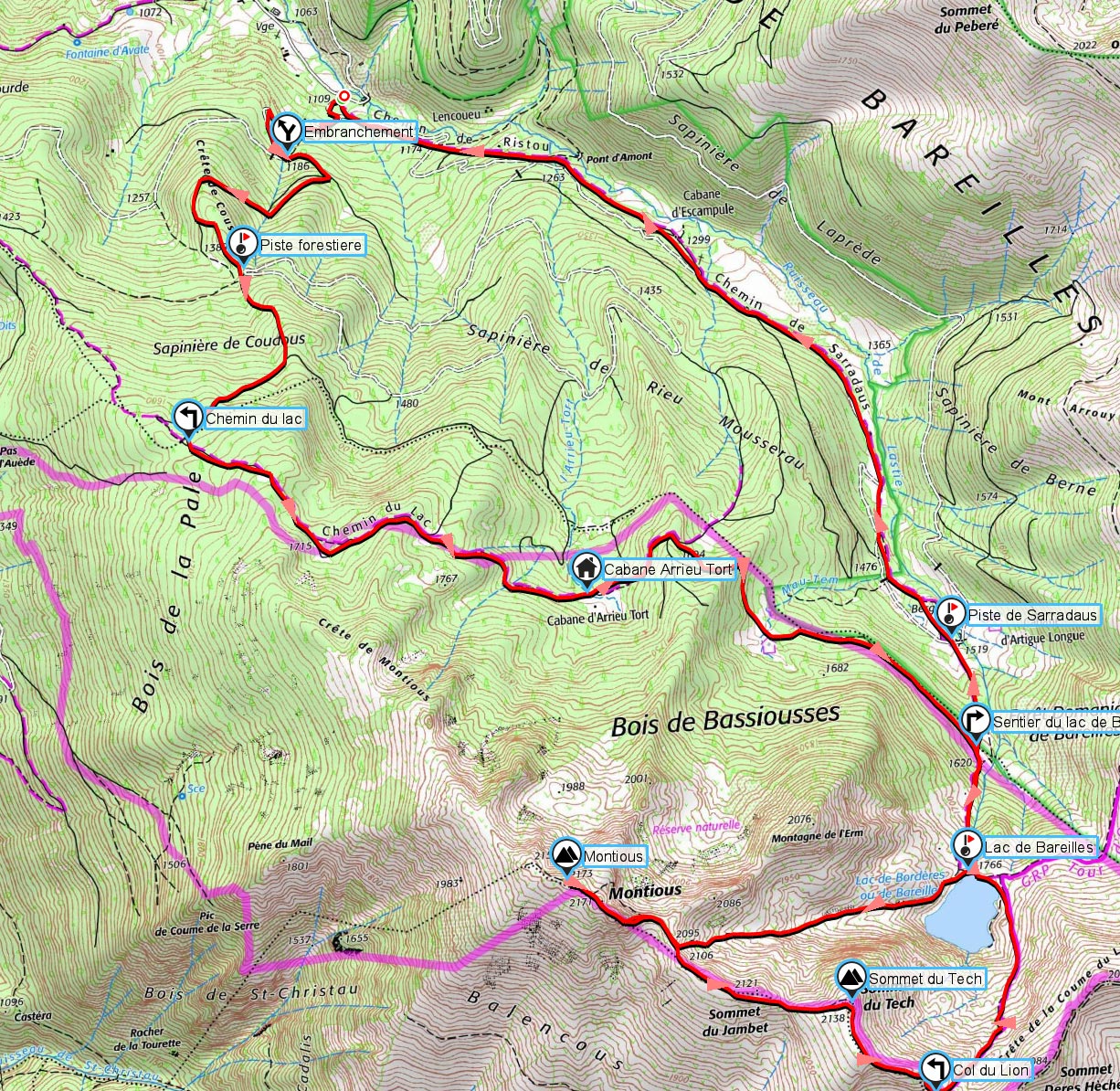 Le versant nord du Montious étant classé "zone de protection renforcée", il convient de d'adapté le circuit pour tenir compte des interdictions. C'est ce que fait ce circuit qui dans sa partie aller propose un itinéraire ludique et peu fréquenté jusqu'au lac de Bareilles.