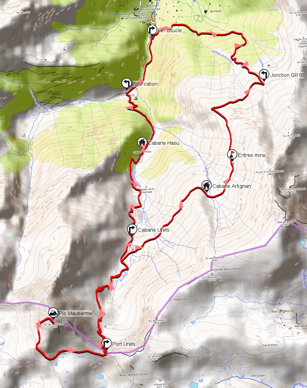 Magnifique randonnée à faire en boucle ... Après le Maubermé on peut réaliser une boucle ...(faite le 1er août 2015) Du Marboré continuer jusqu'au Port de la Hourquette (2452 m et 1h40), Etang de Chichoué (1950m et 2h30), les mines de Bentaillou, le GR10, Eylie (4h35) ... Soit 5h45 depuis la cabane du Port d'Urets... qui n'est utilisée par le berger que pour ses siestes d'après-midi, il n'y couche pas. Offrez-vous une nuit magique à ce belvédère incroyable ! Total 9h55 et 2100 m D+