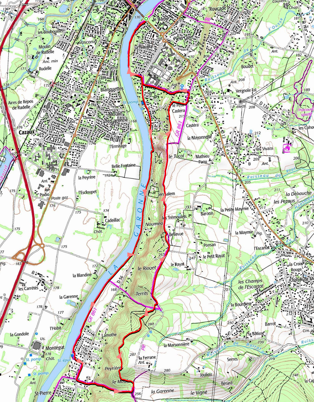 Suivre la D56 à droite. Laisser la 1ère rue à gauche (voie sans issue) et emprunter la seconde. Rejoindre le bord de Garonne, et le suivre à droite par l'itinéraire de l'aller.
