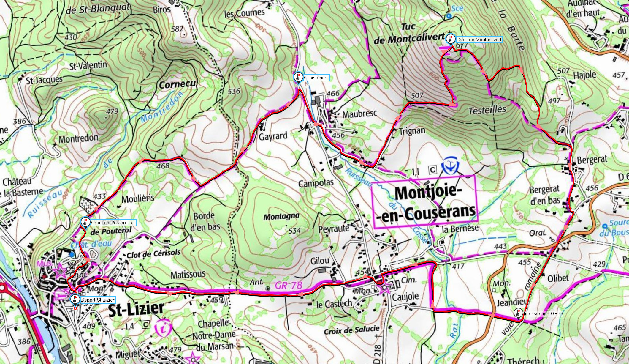 Prendre à droite et suivre le GR78 qui nous conduit sans soucis jusqu'à Monjoie-en-Couserans, puis Saint-Lizier