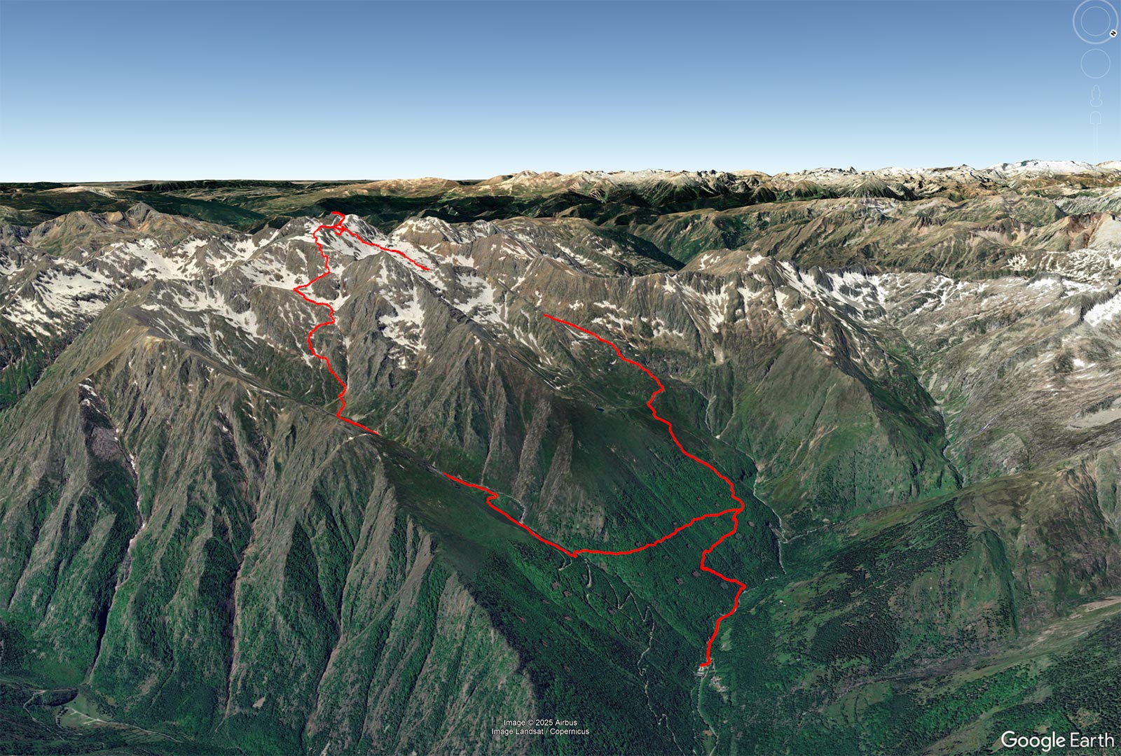 Suivre les pentes sommitales à droite, jusqu'au col de Riufret (2978m). Poursuivre en face à flanc sous la crête. La sente bien marquée remonte jusqu'à un petit col frontalier (3100m) entre le Verdaguer et la pique d'Estats.